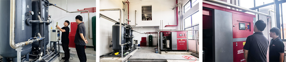 -Gesojev zračni kompresor, ki brez olja brez olja, uporablja čisto vodo kot mazivo, ki daje 100% stisnjen zrak brez olja, ki ustreza standardu razreda 0 ISO 8573-1. Opremljen z natančnim filtracijskim sistemom, učinkovito odstrani delce, večje od 0,01 μm, kar zagotavlja varnost natančne proizvodnje instrumentov.